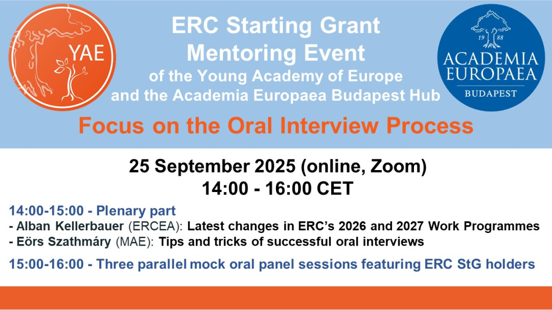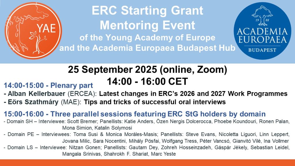 On September 25, 2025, from 14:00 to 16:00 CET, the Young Academy of Europe (YAE), in collaboration with the Academia Europaea (AE) Budapest Knowledge Hub, hosted an online event on Zoom for researchers worldwide who are interested in applying for the next round of the European Research Council’s (ERC) Starting Grant (StG). One of the main goals of this event series is to promote wider participation among researchers from EU13, Associated Countries as well as outside of Europe.